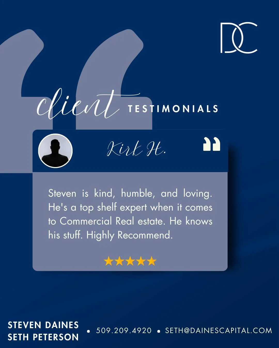 βSeth and Steven were absolutely phenomenal! After trying a couple different brokers unsuccessfully, we found Daines Capital and are so glad we did. Highly, highly recommend for great service, communication, and help in finding a business property.β