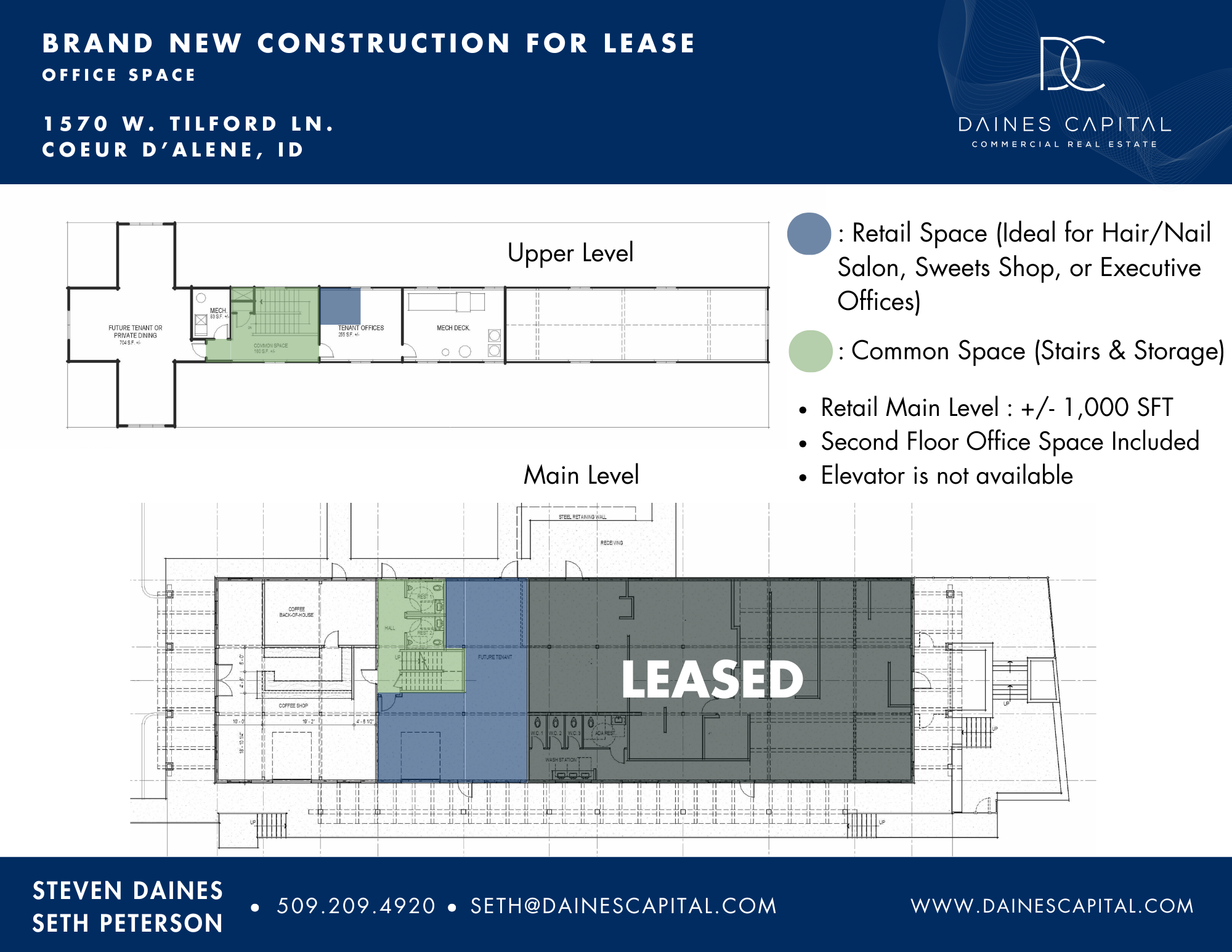 Brand-new ±1,100 SF main-level retail space coming soon to 1570 W. Tilford Ln. in Coeur d’Alene. This thoughtfully designed suite is part of a striking ±7,500 SF mixed-use building scheduled to break ground in January 2026, with delivery anticipated in summer 2026. The space includes access to second-floor office areas, shared stair and storage spaces (no elevator), and is ideal for uses such as a hair or nail salon, sweets shop, boutique retail, or executive office setup. Offered at $30/SF NNN with $20/SF in tenant improvement allowance, the building sits on 0.38 acres within the C-17 PUD zoning district and enjoys a prime location just 1.9 miles from Downtown CDA and near major amenities, hotels, parks, and key traffic corridors—providing strong visibility and accessibility for a wide range of retail or service-oriented users.